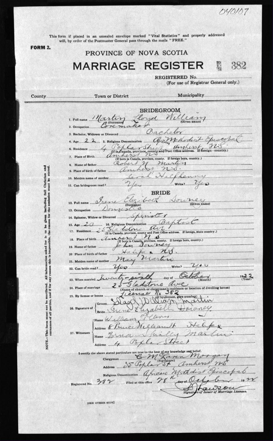 Registration: Year: 1922 number: 40107
