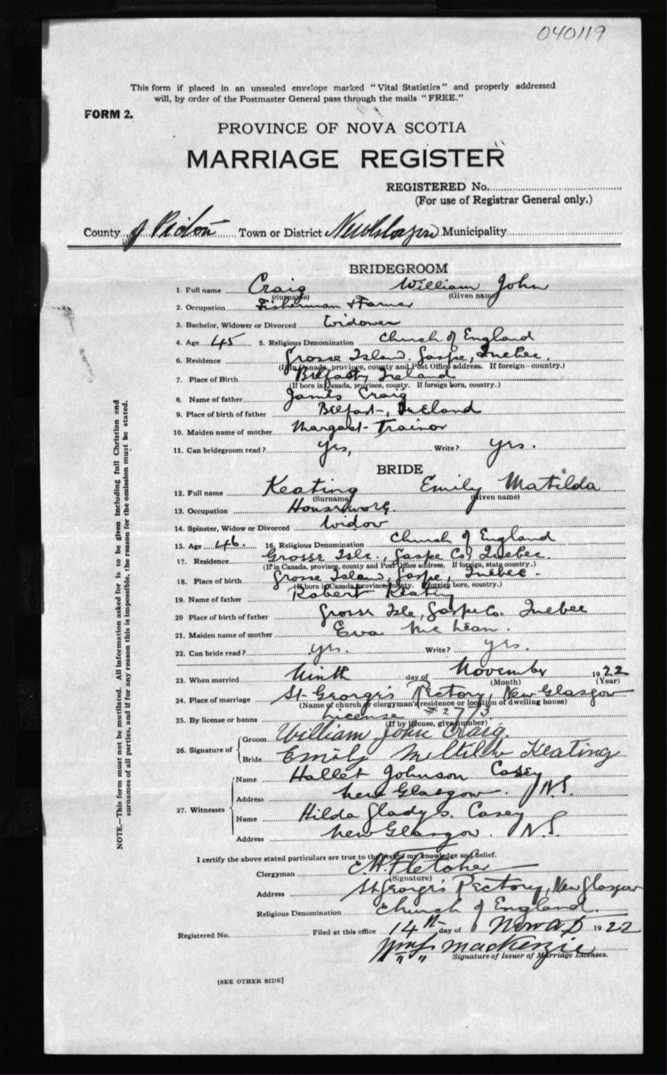 Registration: Year: 1922 number: 40119