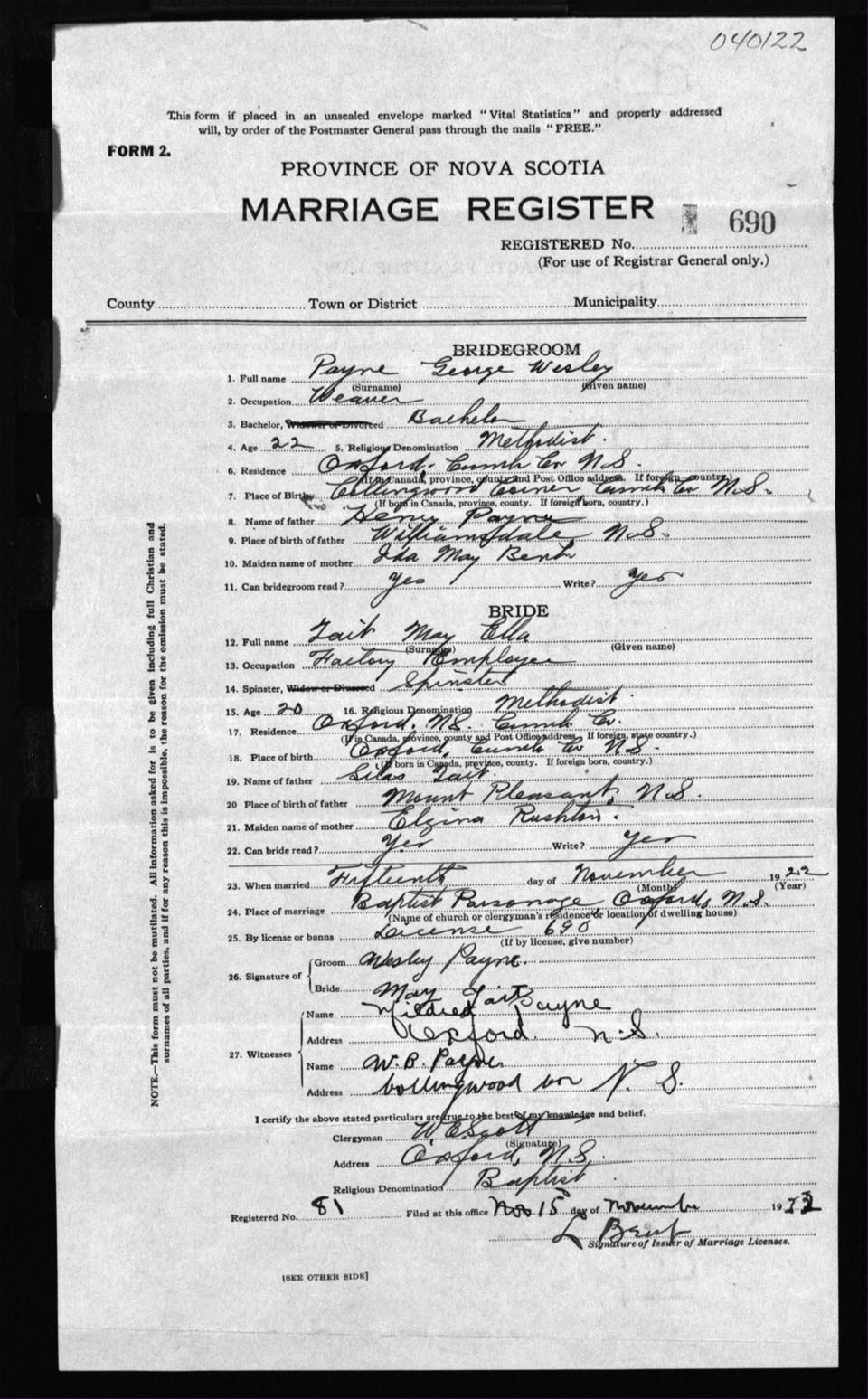 Registration: Year: 1922 number: 40122