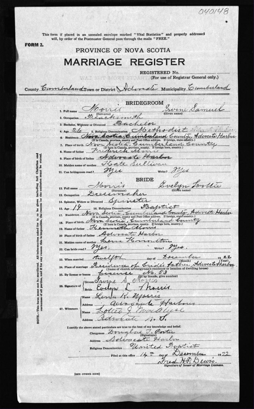 Registration: Year: 1922 number: 40148