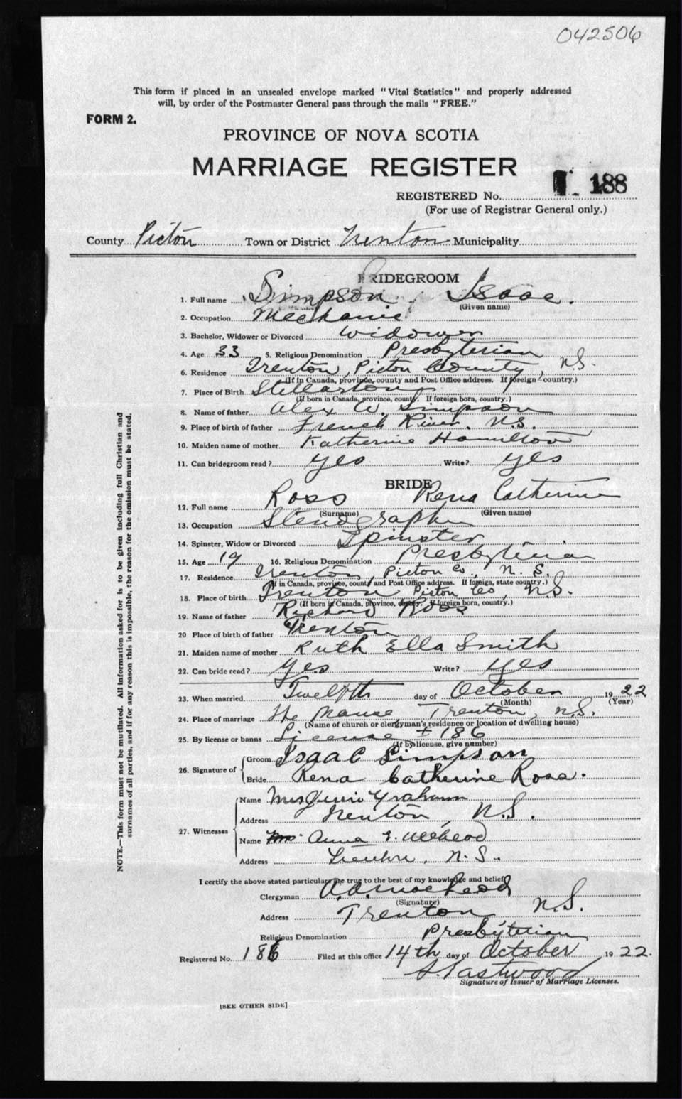 Registration: Year: 1922 number: 42506