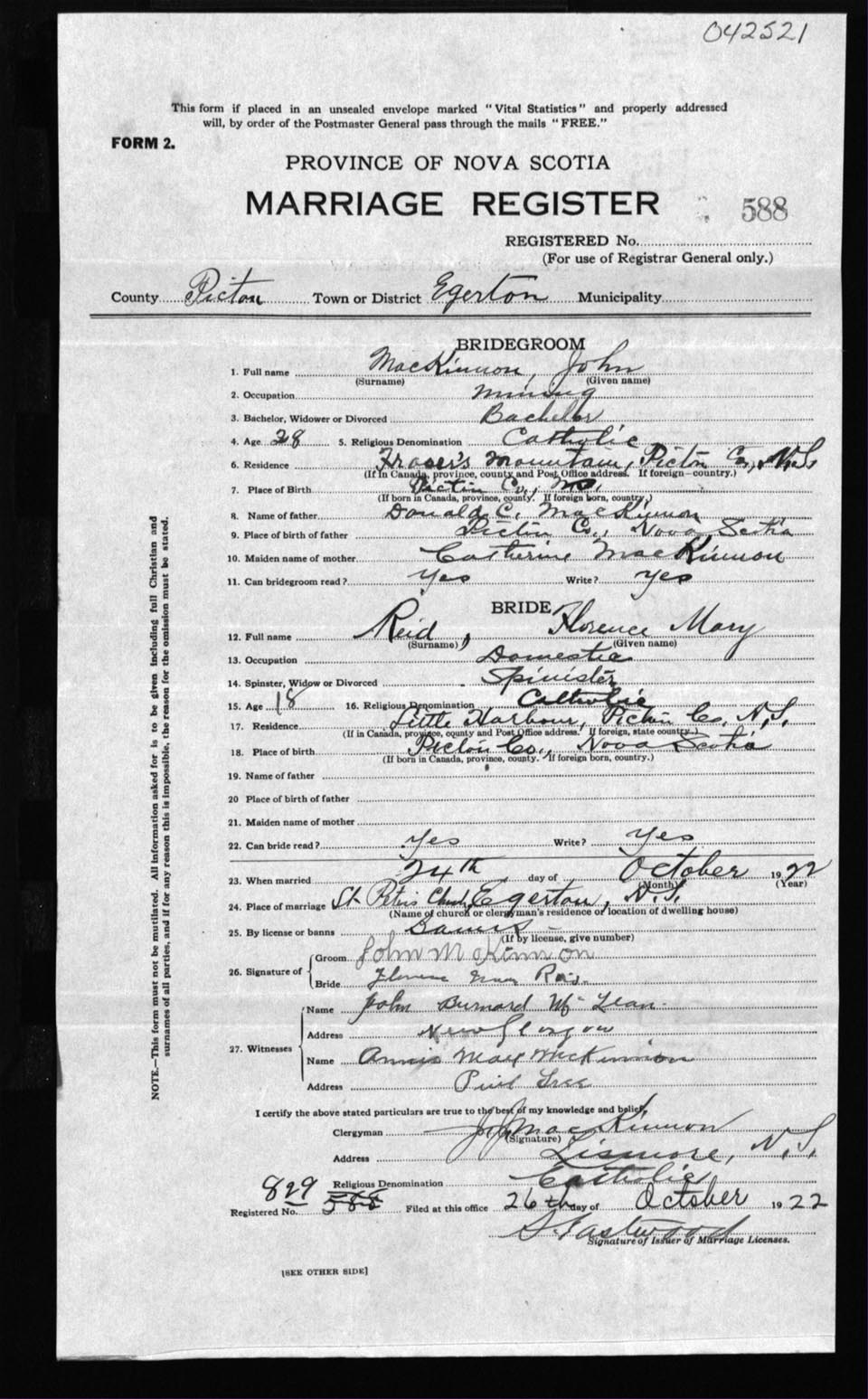 Registration: Year: 1922 number: 42521