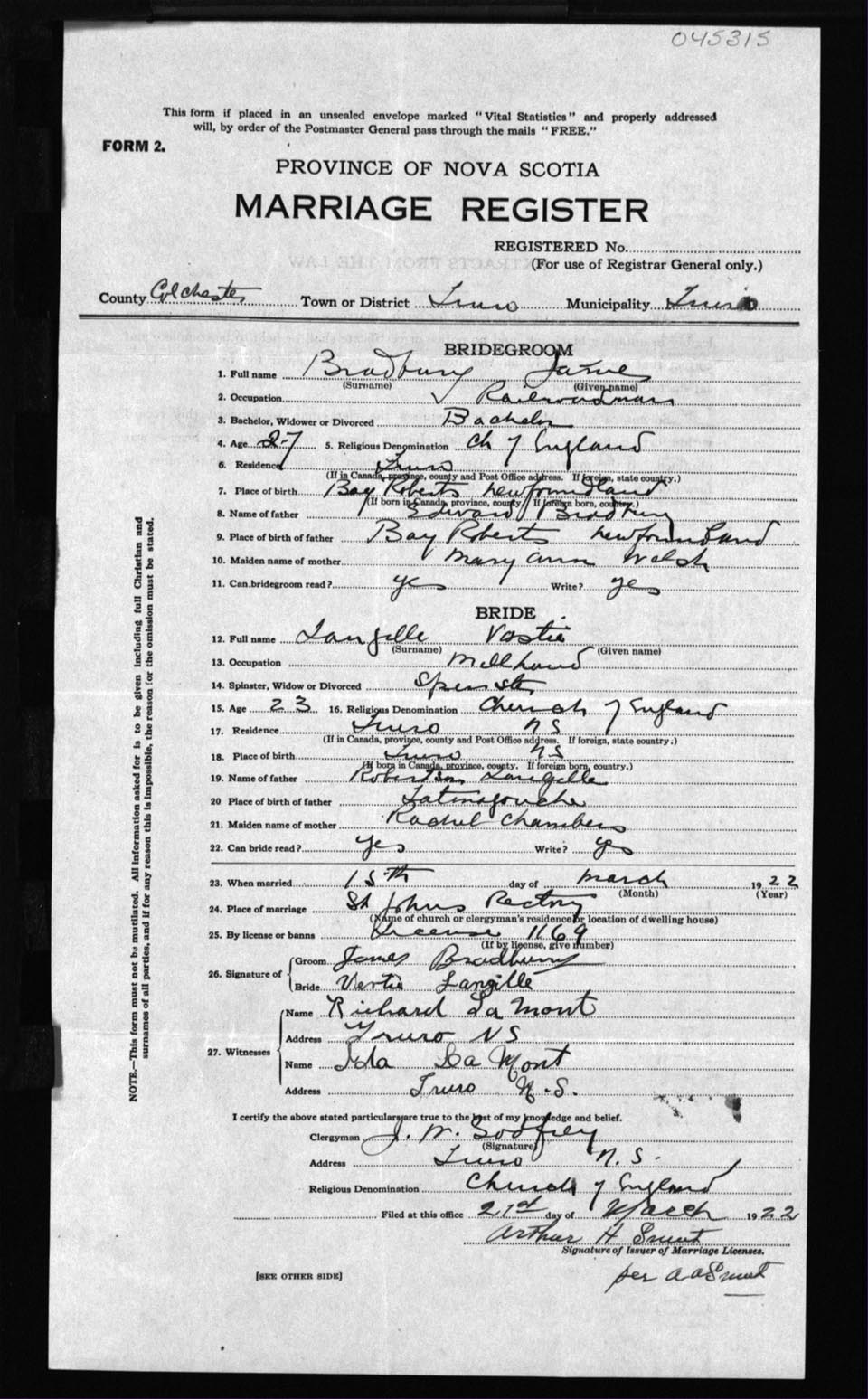 Registration: Year: 1922 number: 45315