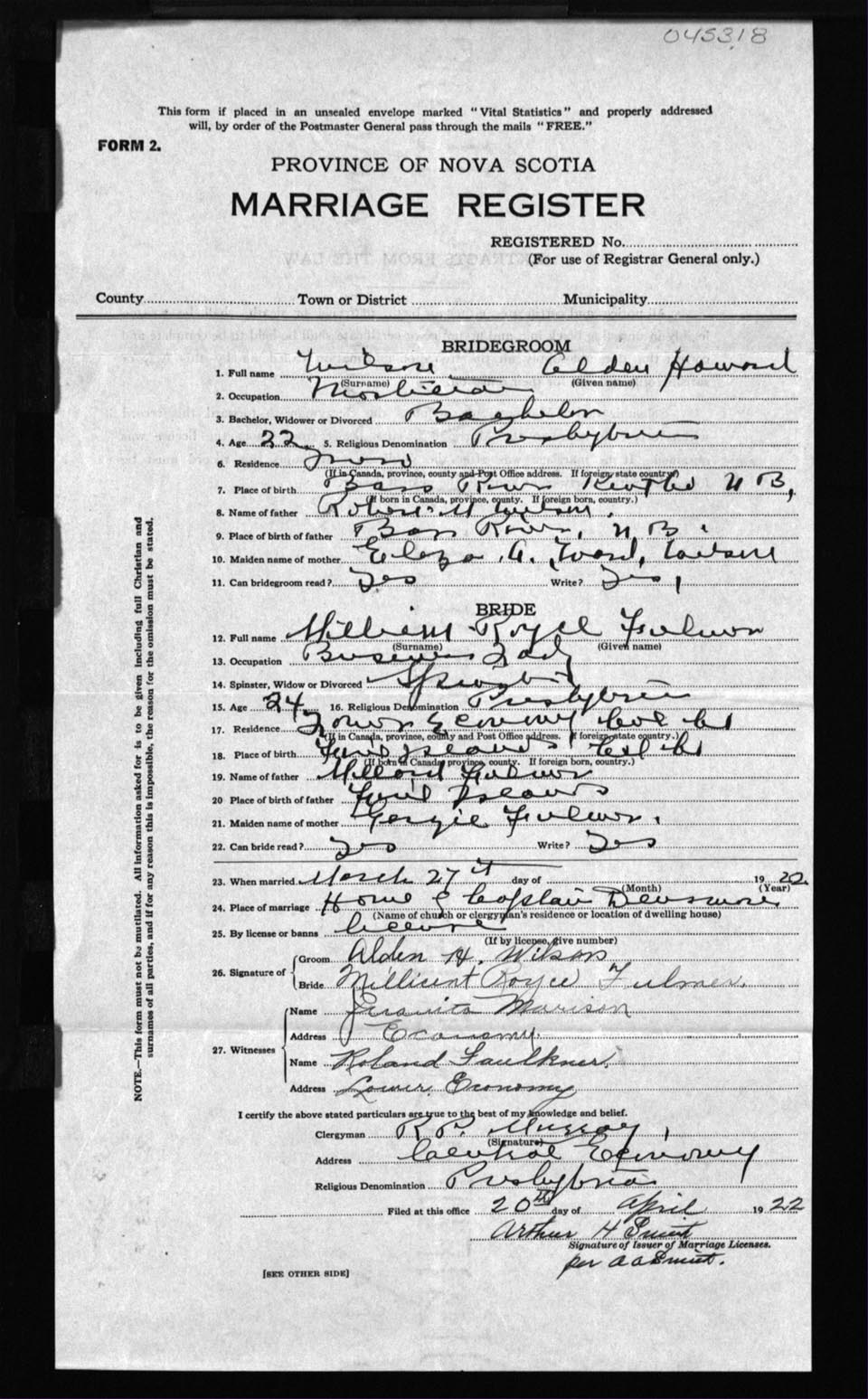 Registration: Year: 1922 number: 45318