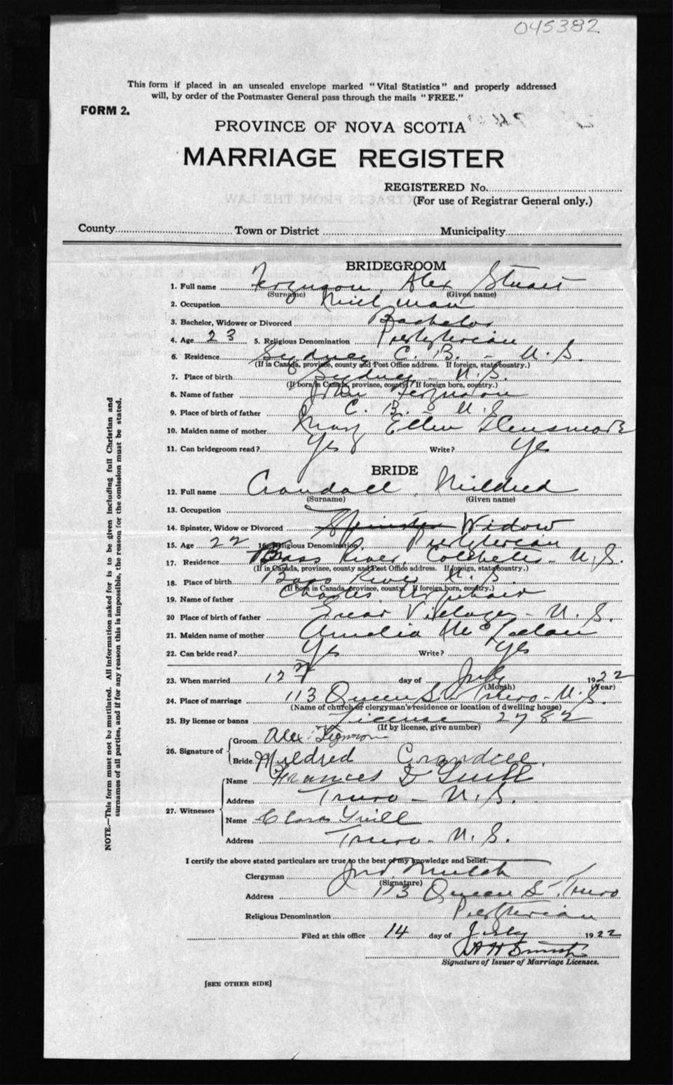 Registration: Year: 1922 number: 45382