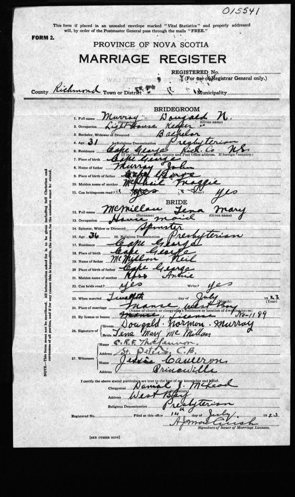Registration: Year: 1923 number: 15541