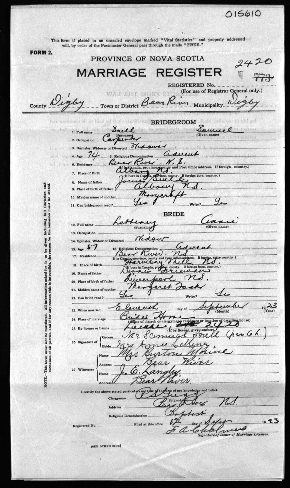 Registration: Year: 1923 number: 15610