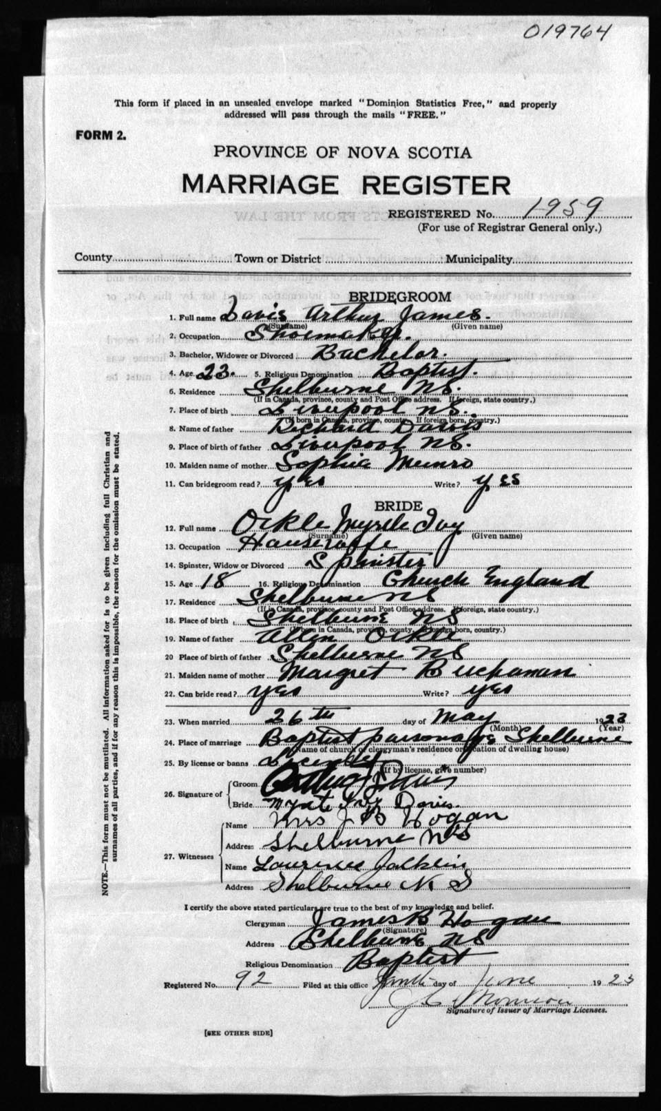Registration: Year: 1923 number: 19764
