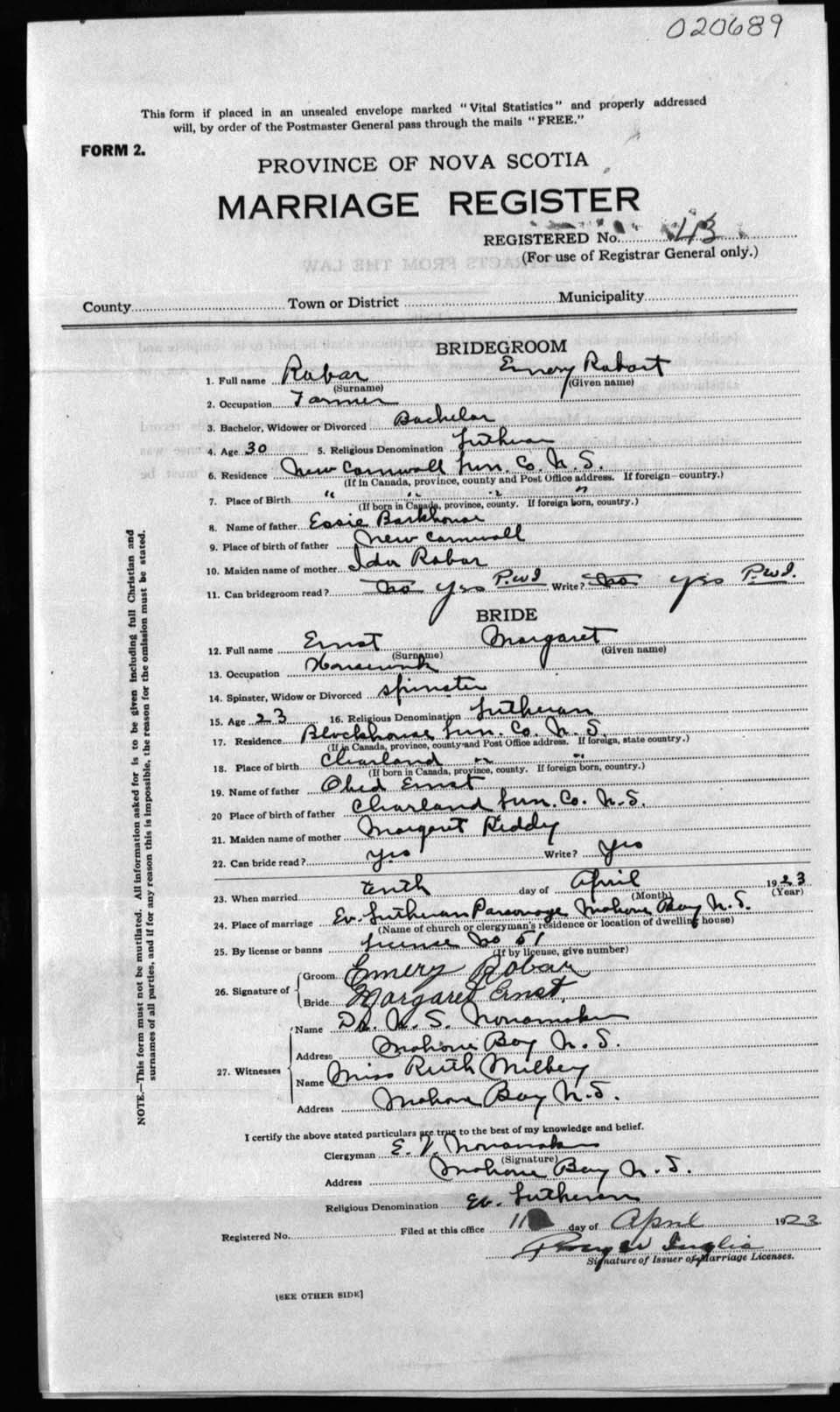 Registration: Year: 1923 number: 20689