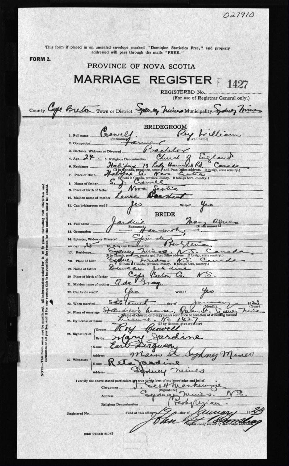 Registration: Year: 1923 number: 27910