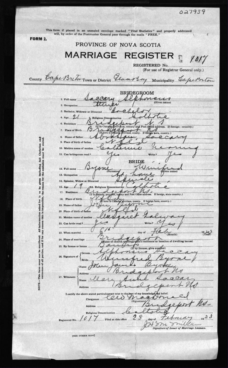 Registration: Year: 1923 number: 27939