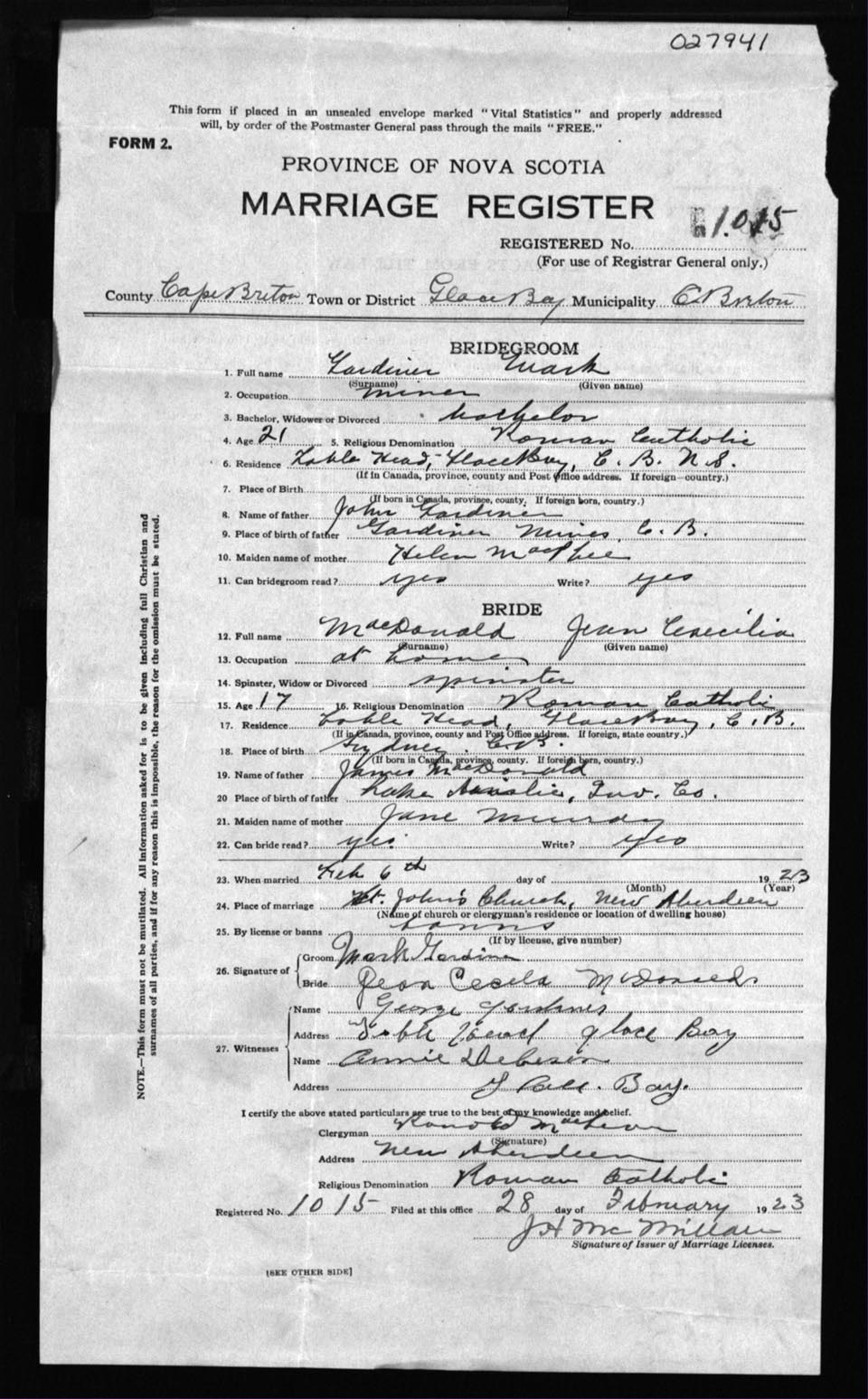 Registration: Year: 1923 number: 27941