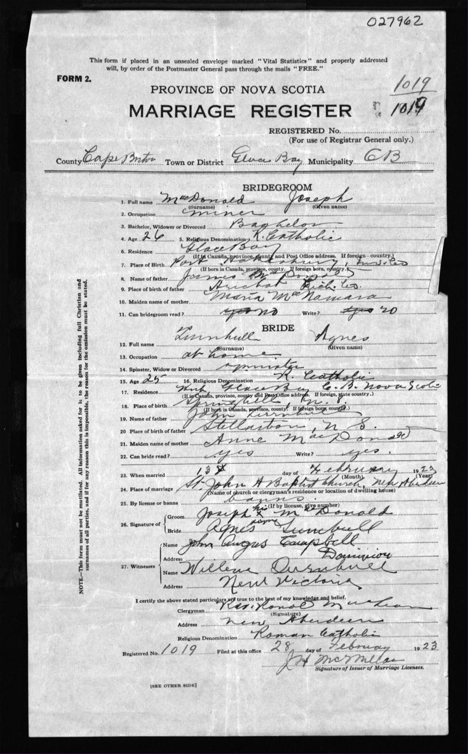 Registration: Year: 1923 number: 27962