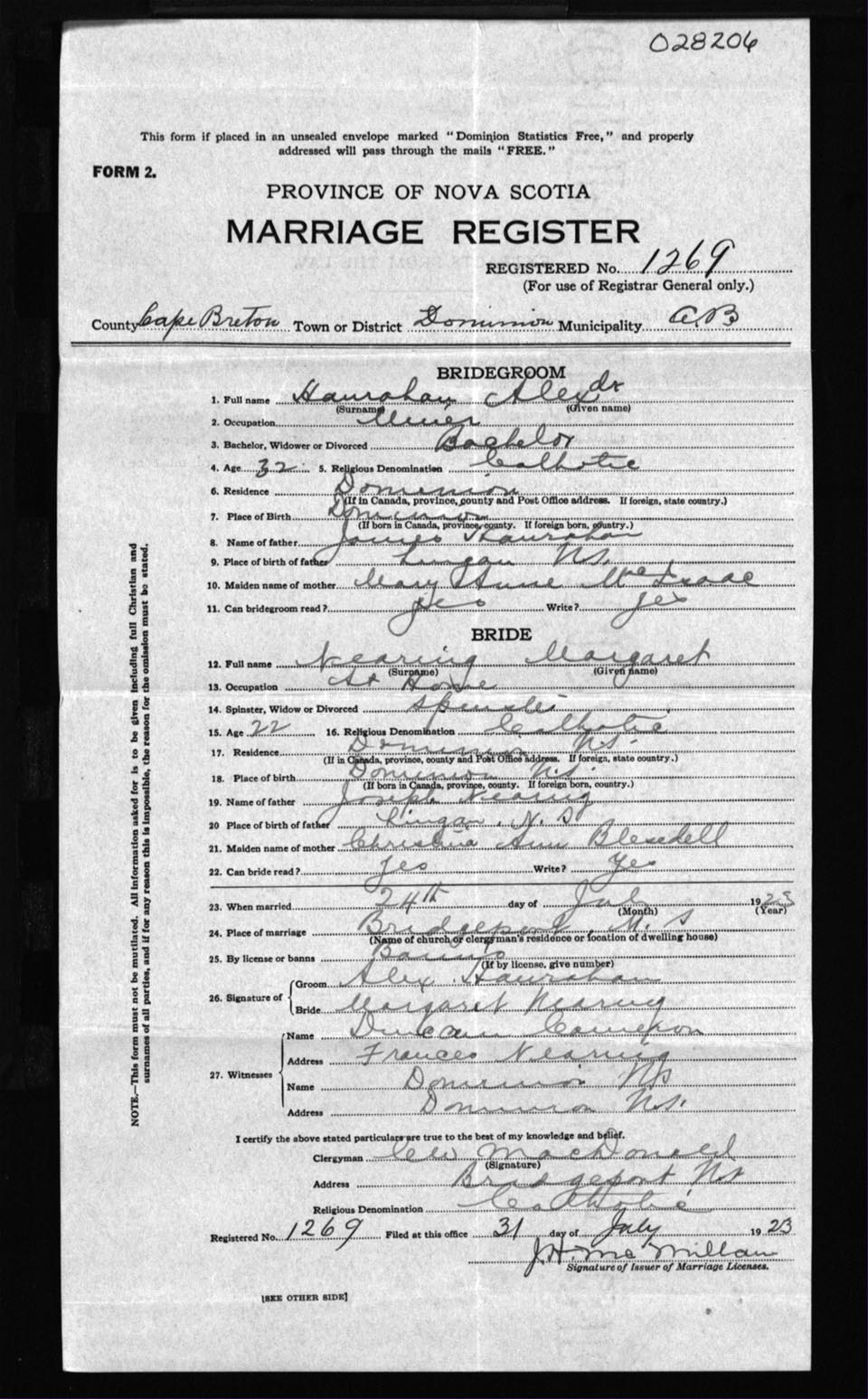 Registration: Year: 1923 number: 28206