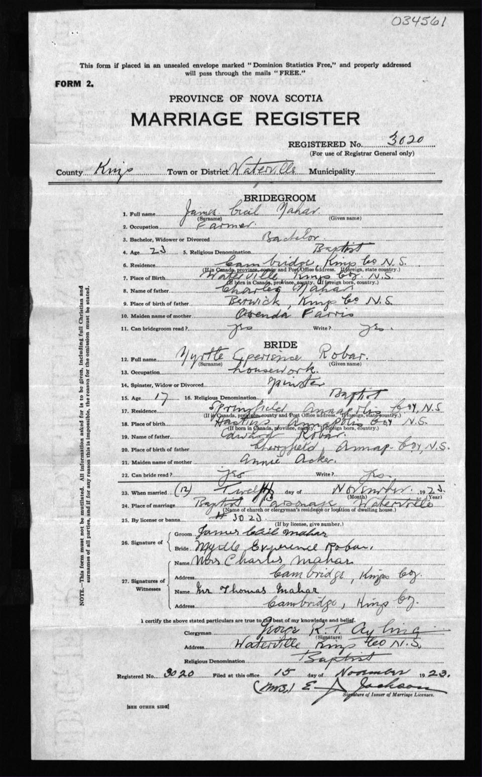 Registration: Year: 1923 number: 34561