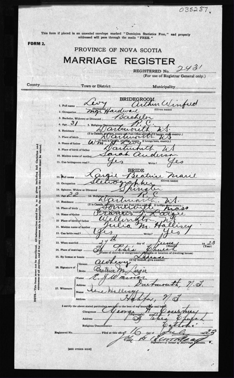 Registration: Year: 1923 number: 35257