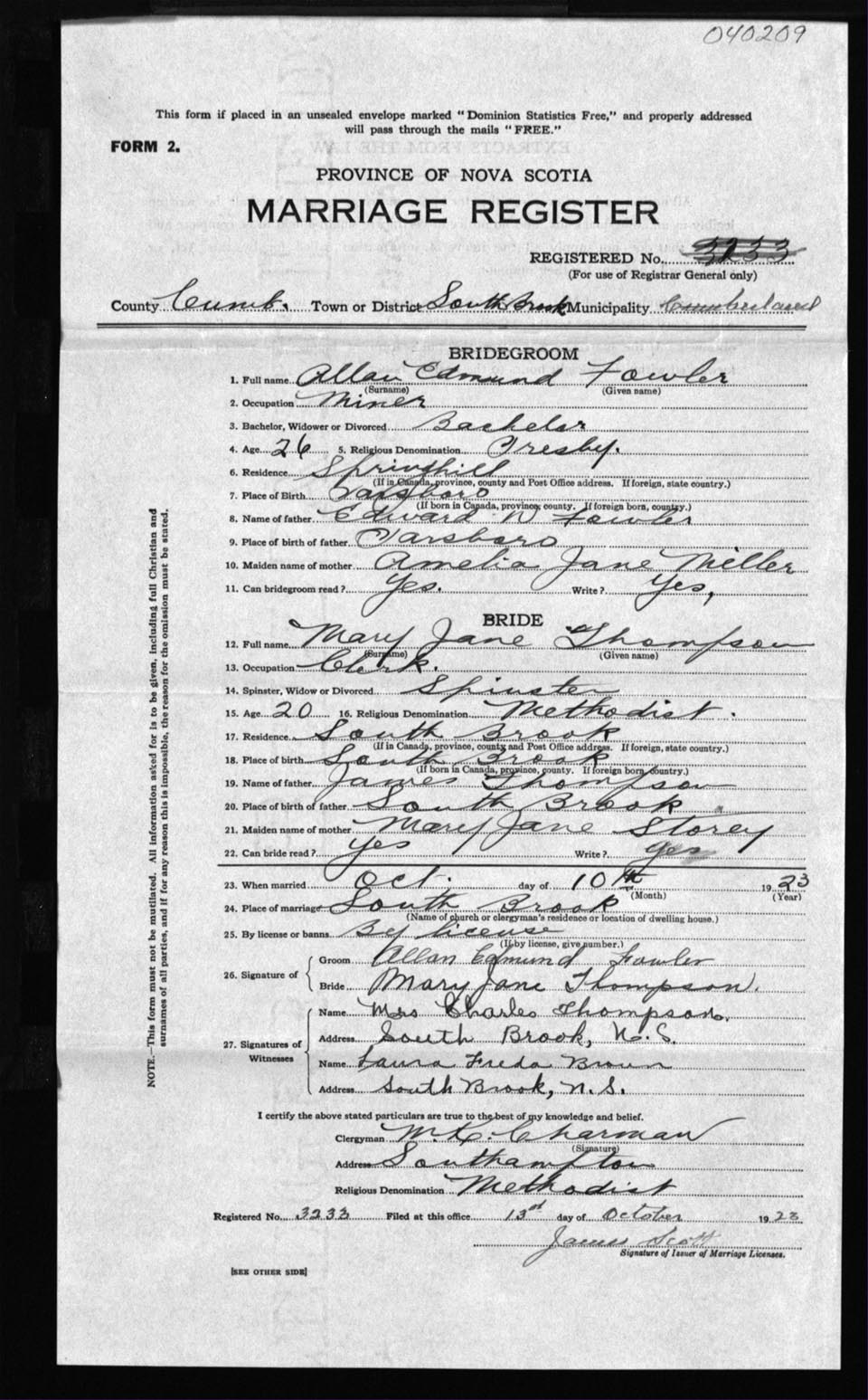 Registration: Year: 1923 number: 40209