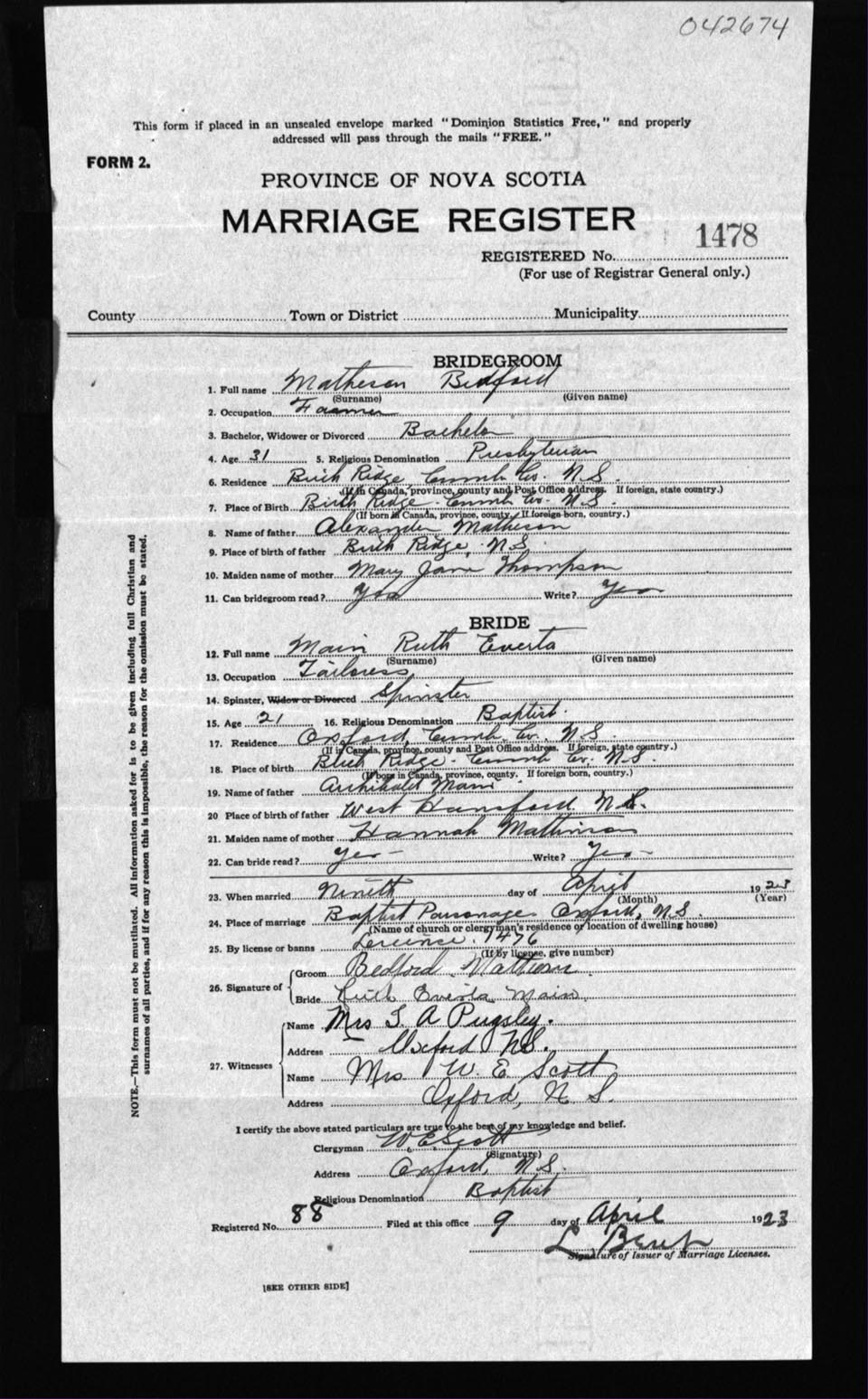 Registration: Year: 1923 number: 42674