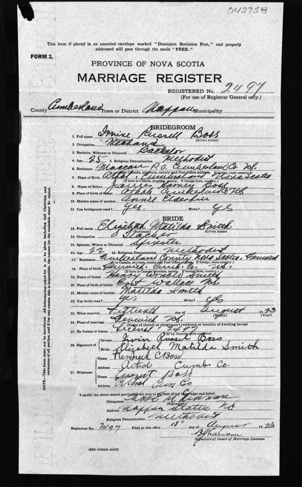 Registration: Year: 1923 number: 42758