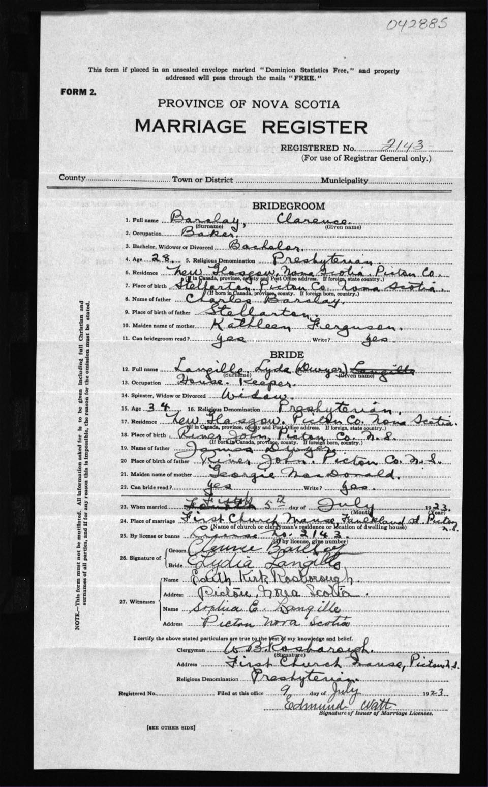 Registration: Year: 1923 number: 42885