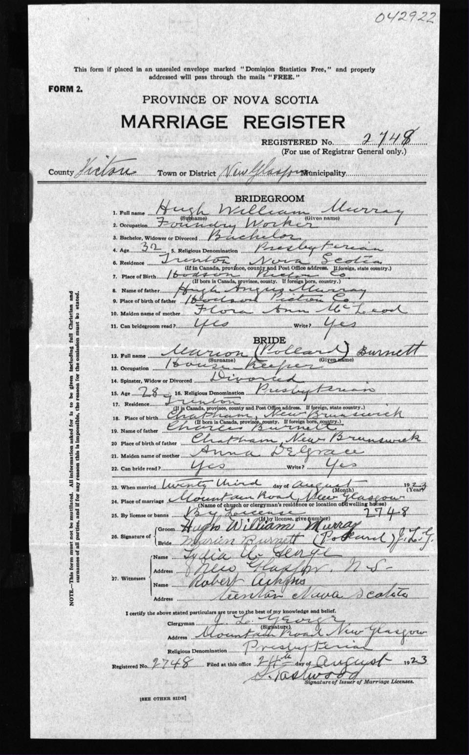 Registration: Year: 1923 number: 42922