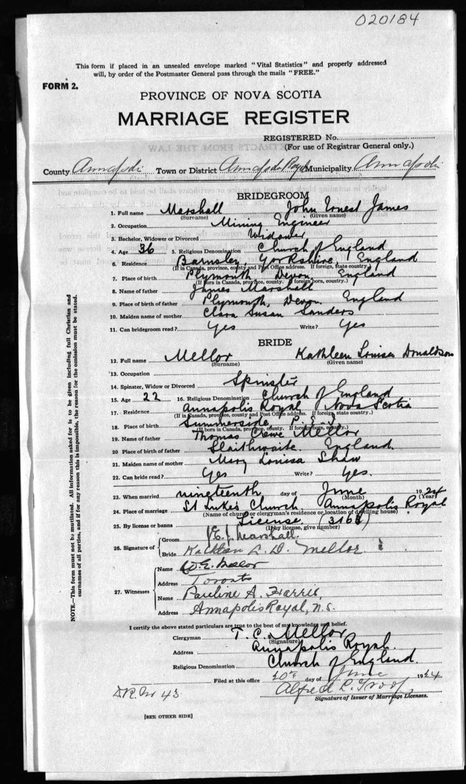 Registration: Year: 1924 number: 20184