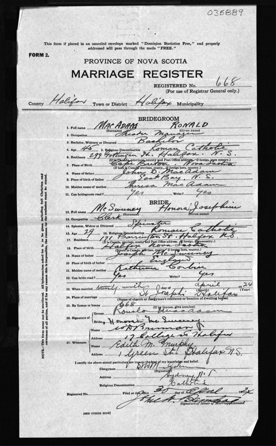 Registration: Year: 1924 number: 35889