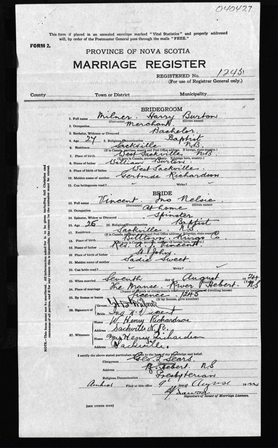 Registration: Year: 1924 number: 40427
