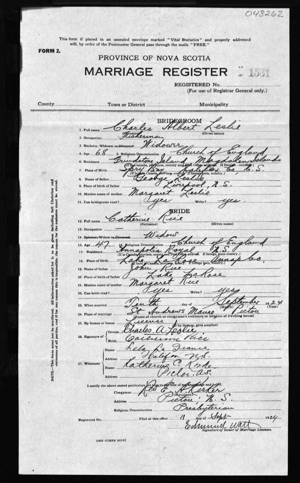 Registration: Year: 1924 number: 43262