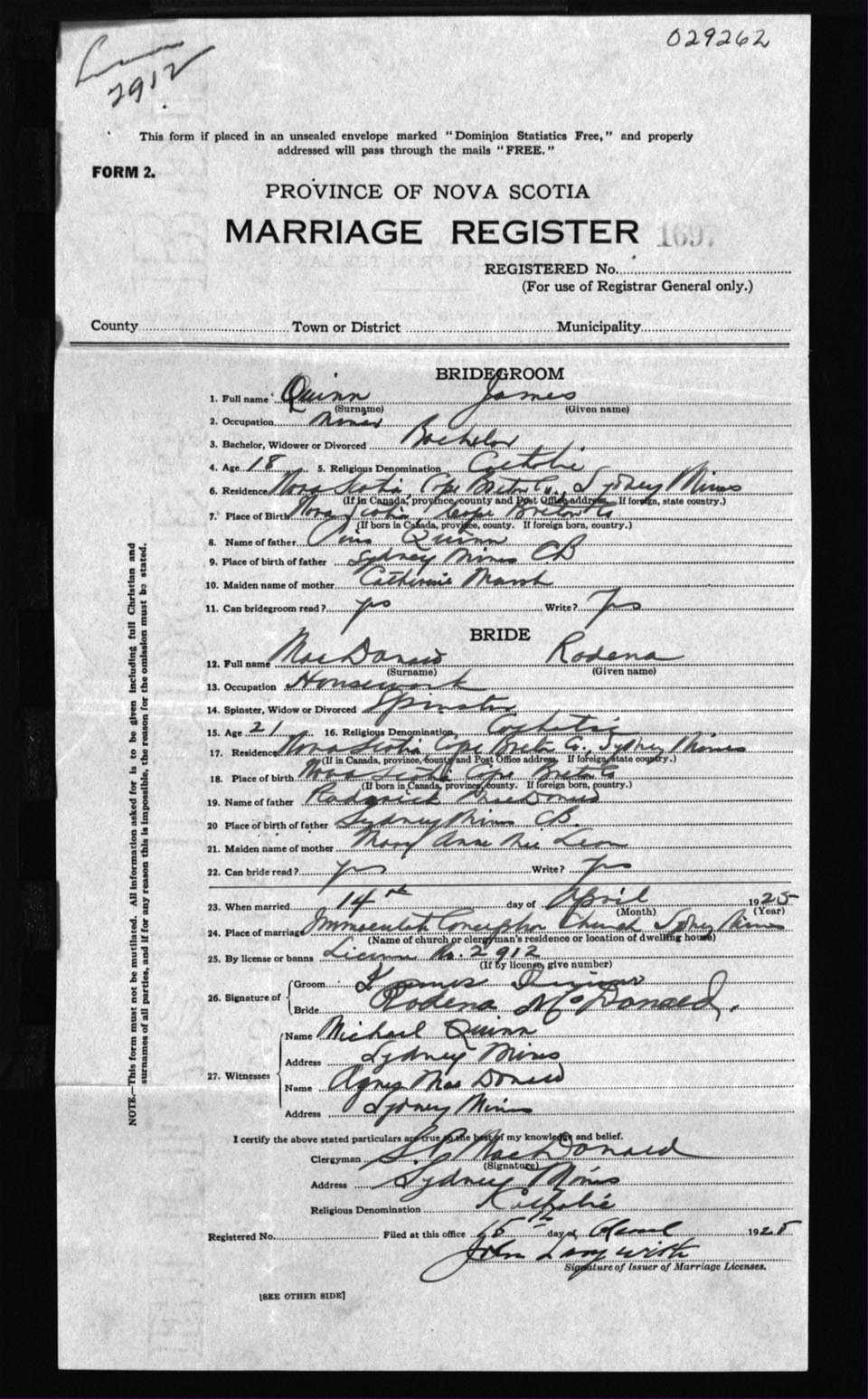 Registration: Year: 1925 number: 29262