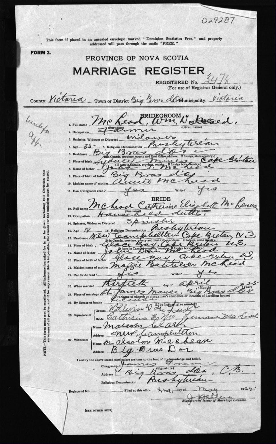 Registration: Year: 1925 number: 29287