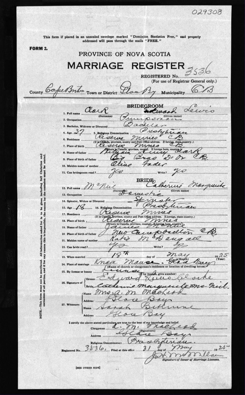 Registration: Year: 1925 number: 29308