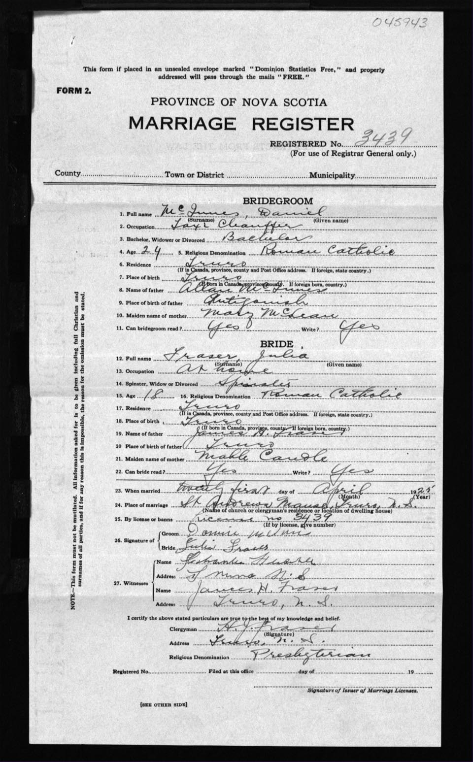 Registration: Year: 1925 number: 45943