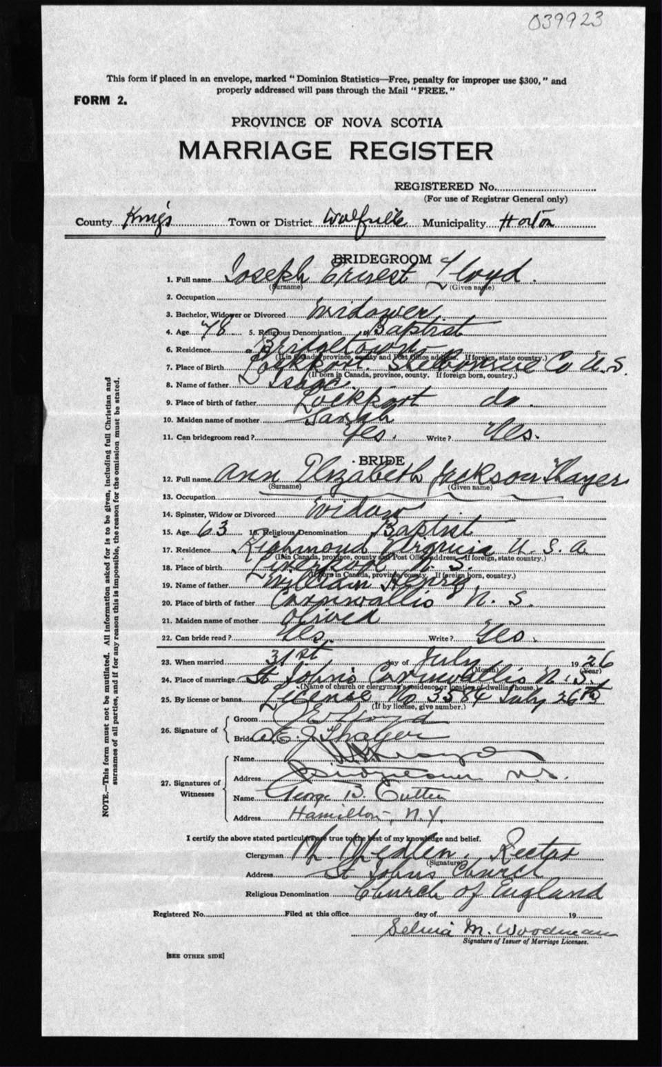 Registration: Year: 1926 number: 39923