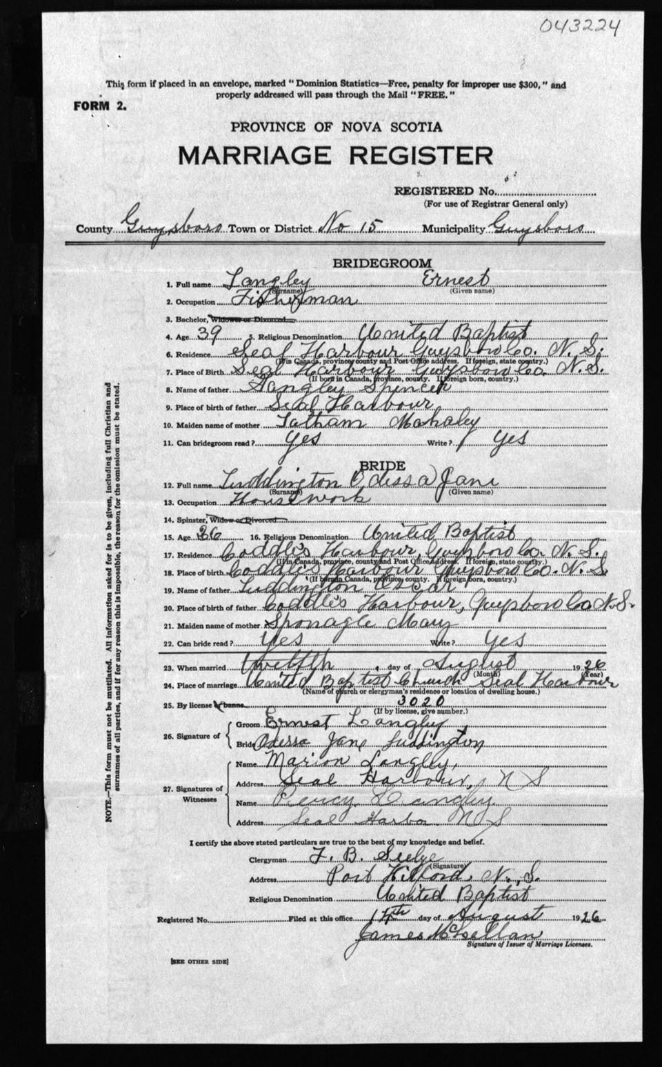 Registration: Year: 1926 number: 43224