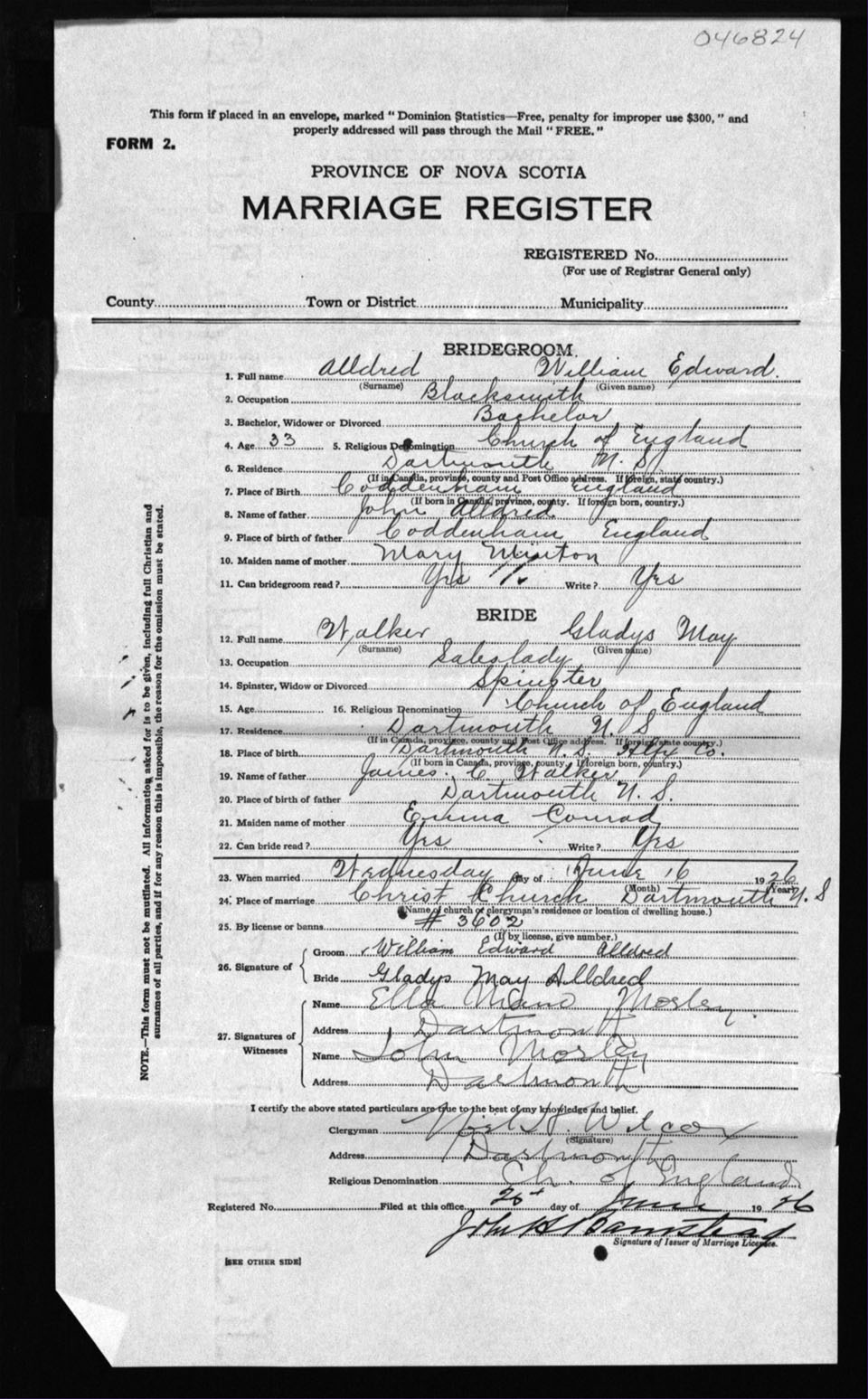 Registration: Year: 1926 number: 46824