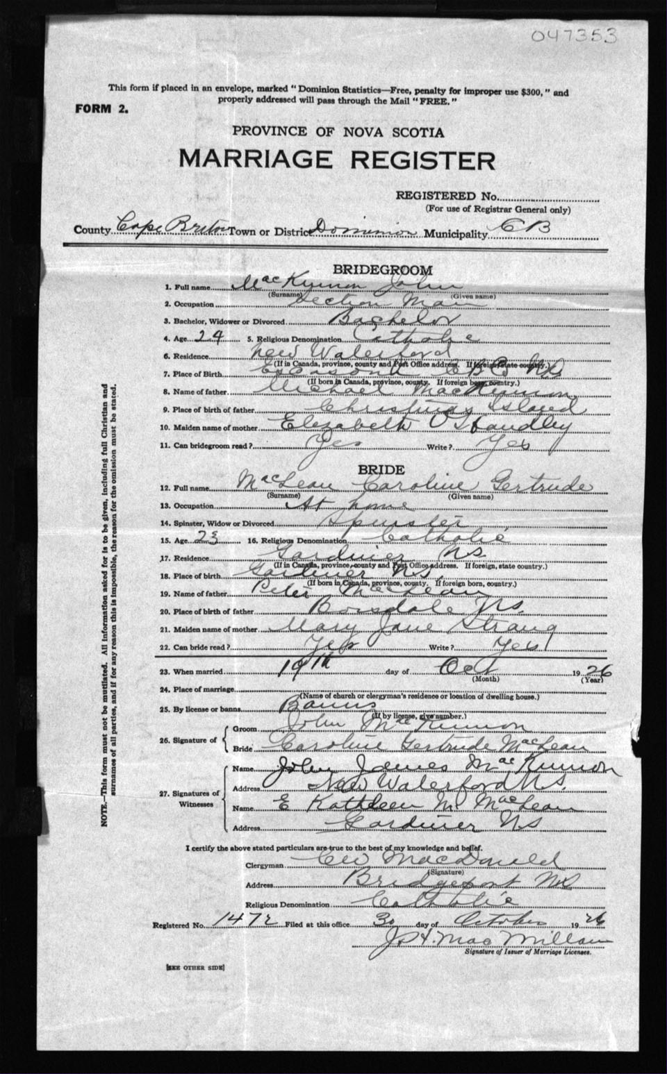 Registration: Year: 1926 number: 47353