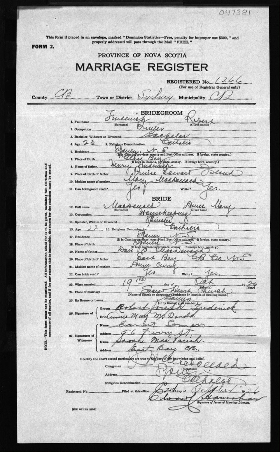 Registration: Year: 1926 number: 47381