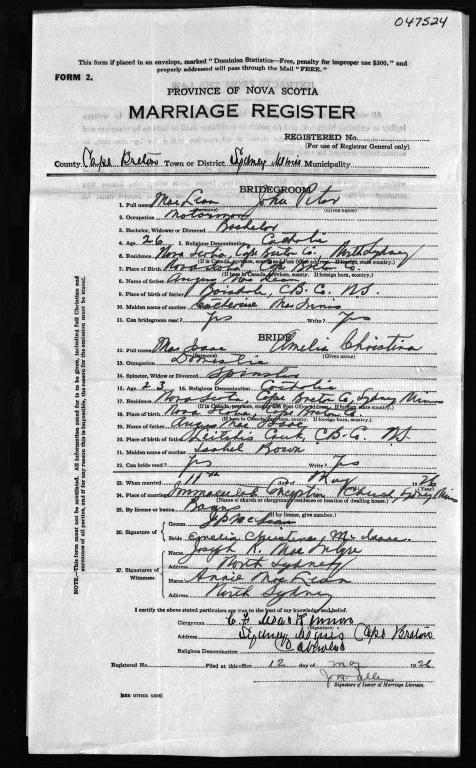 Registration: Year: 1926 number: 47524