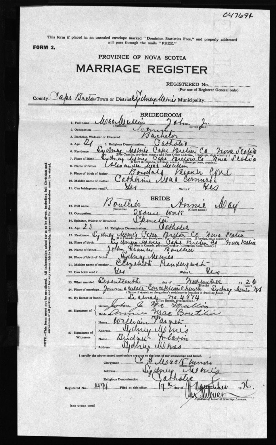 Registration: Year: 1926 number: 47691