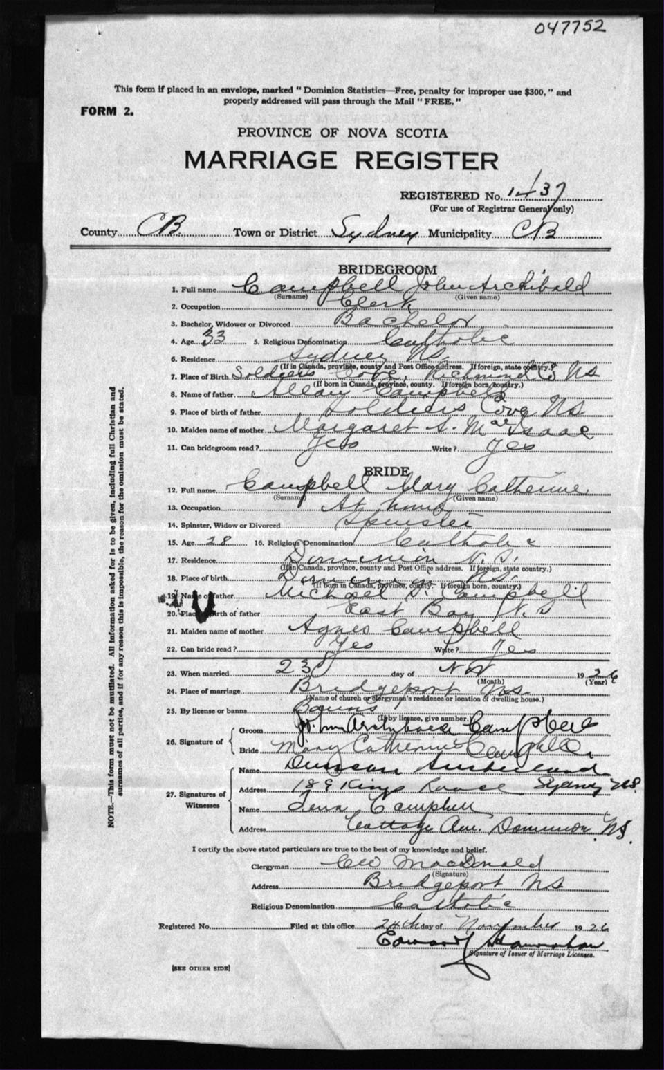 Registration: Year: 1926 number: 47752