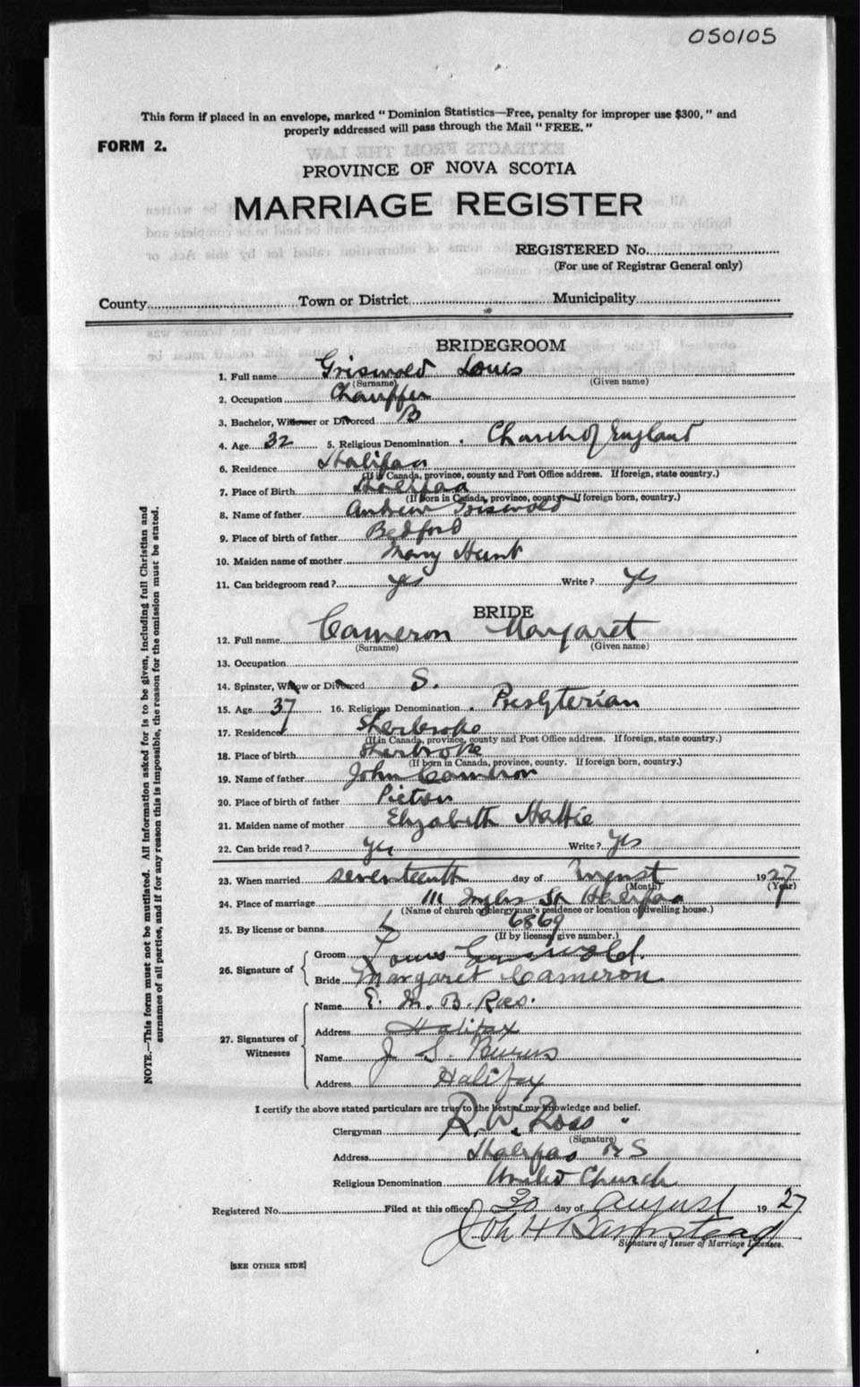 Registration: Year: 1927 number: 50105
