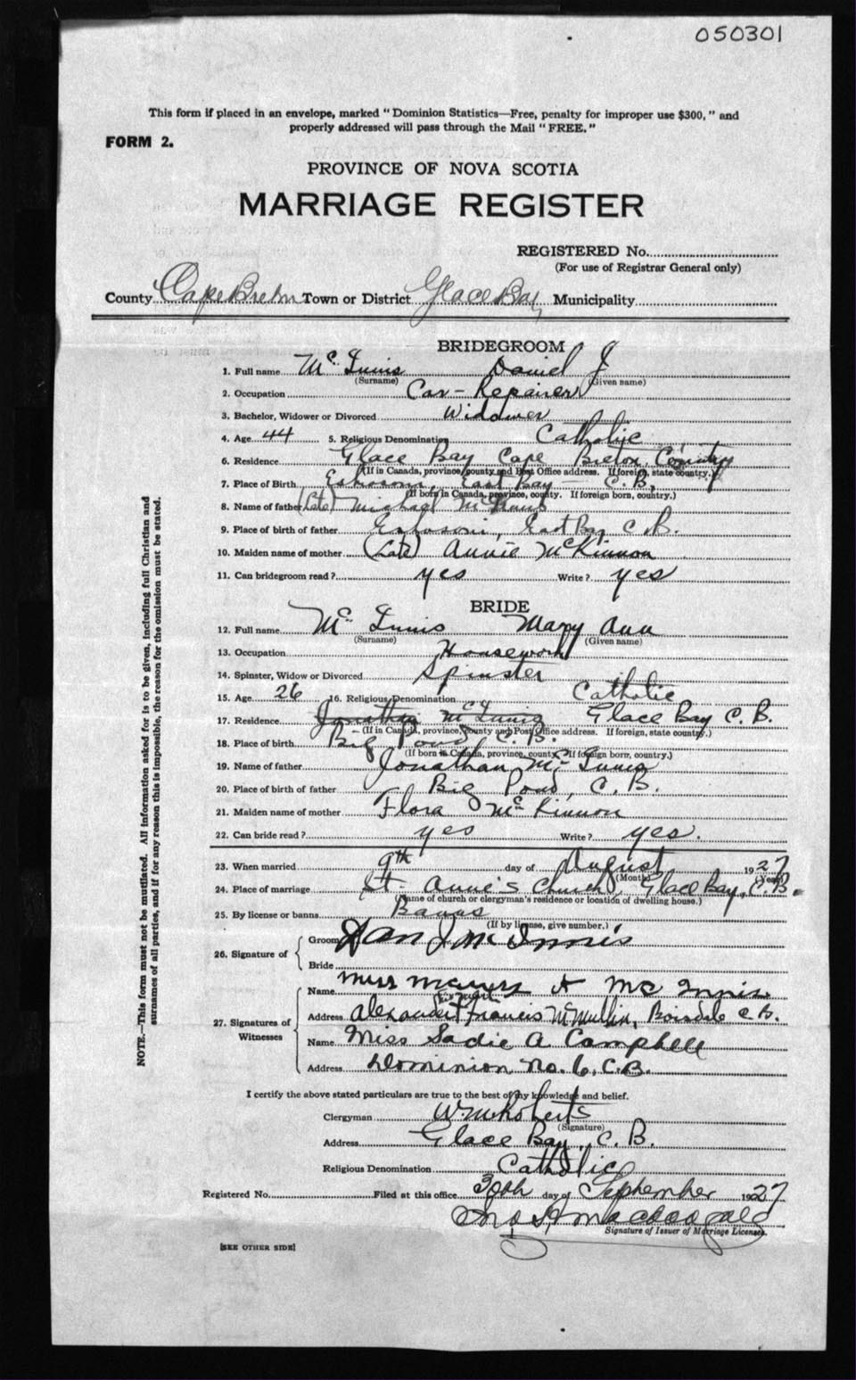 Registration: Year: 1927 number: 50301
