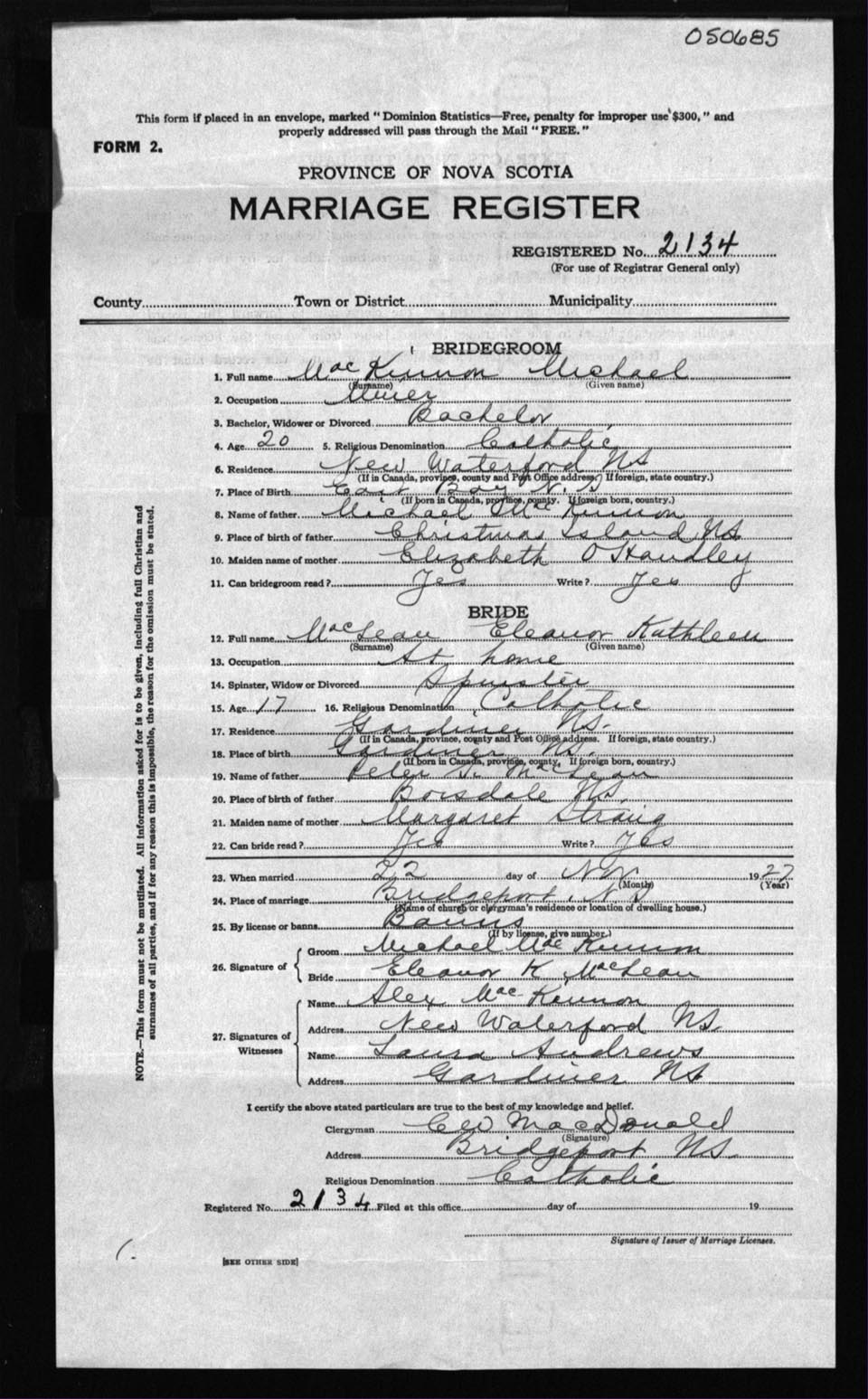 Registration: Year: 1927 number: 50685