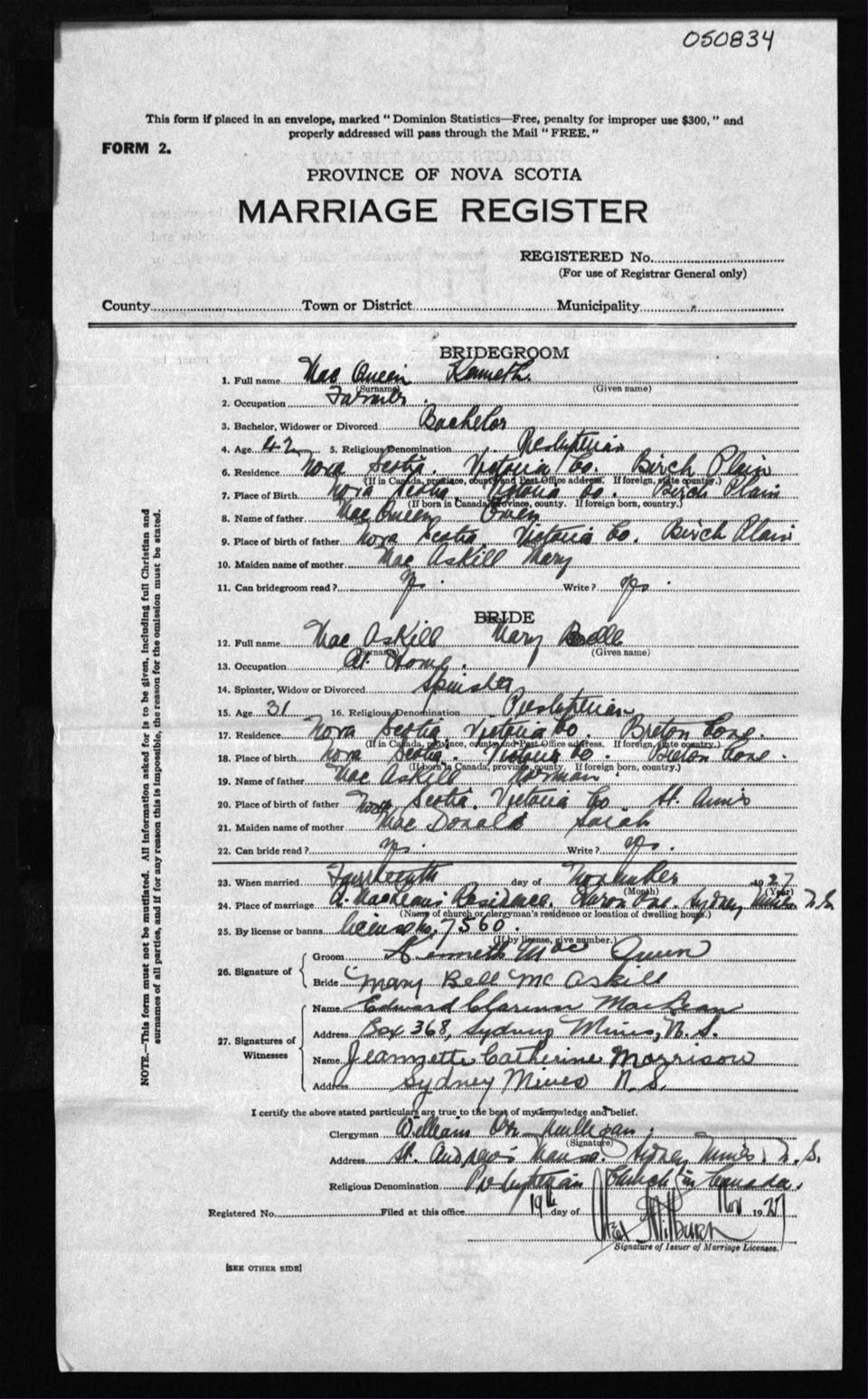 Registration: Year: 1927 number: 50834