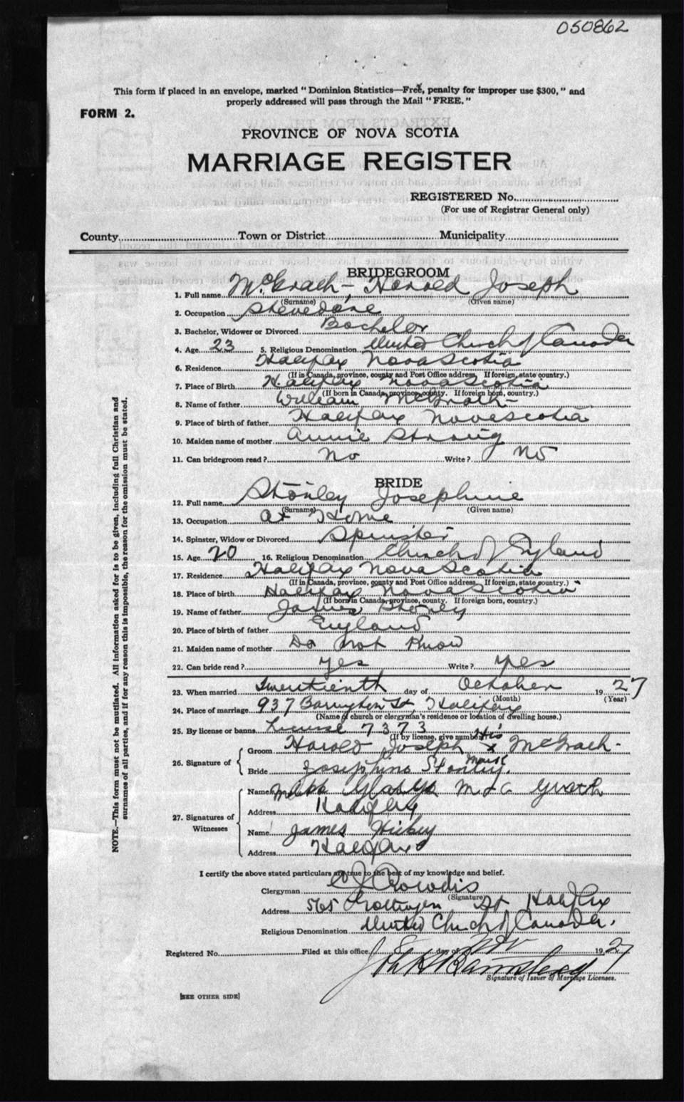 Registration: Year: 1927 number: 50862