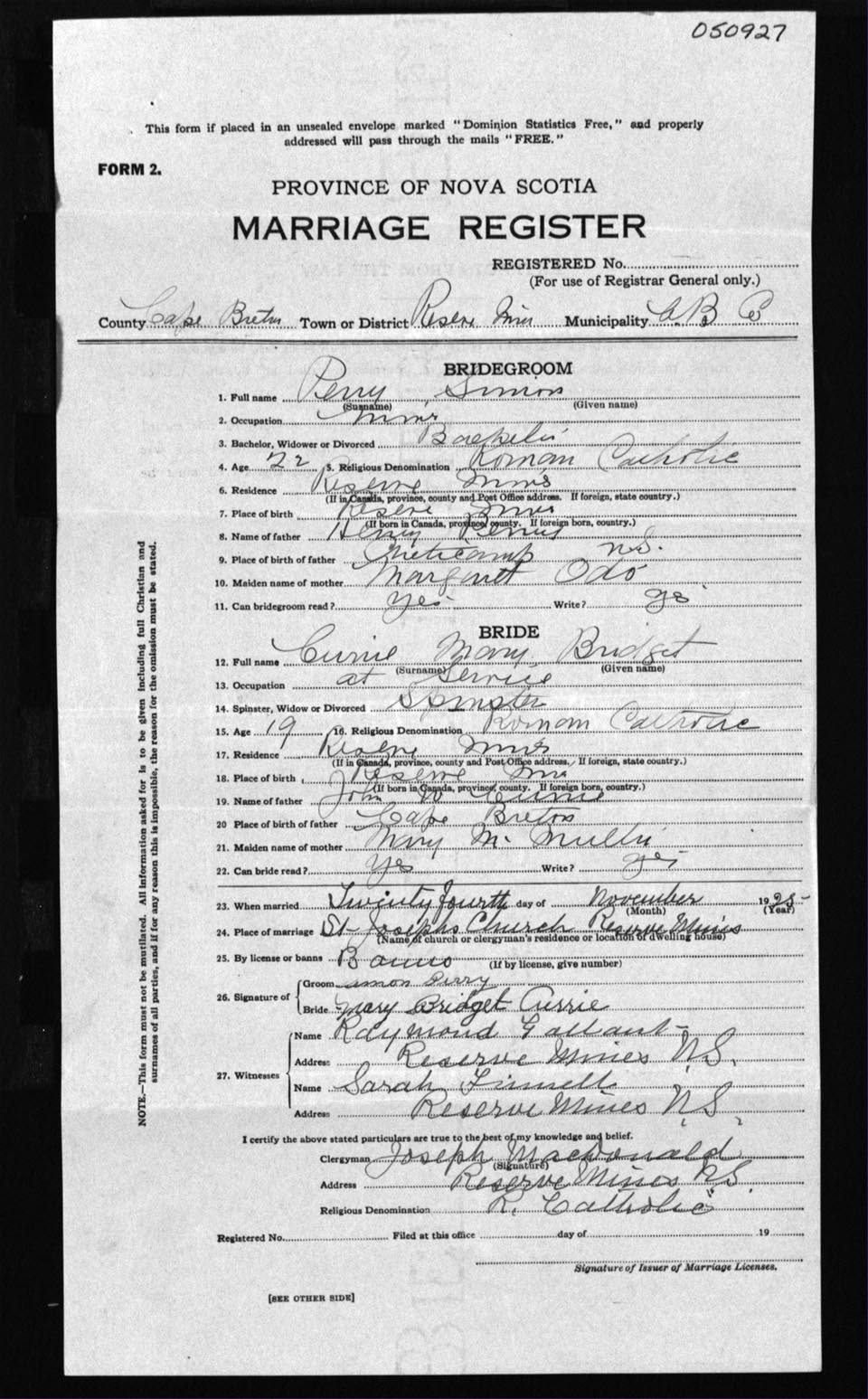 Registration: Year: 1927 number: 50927