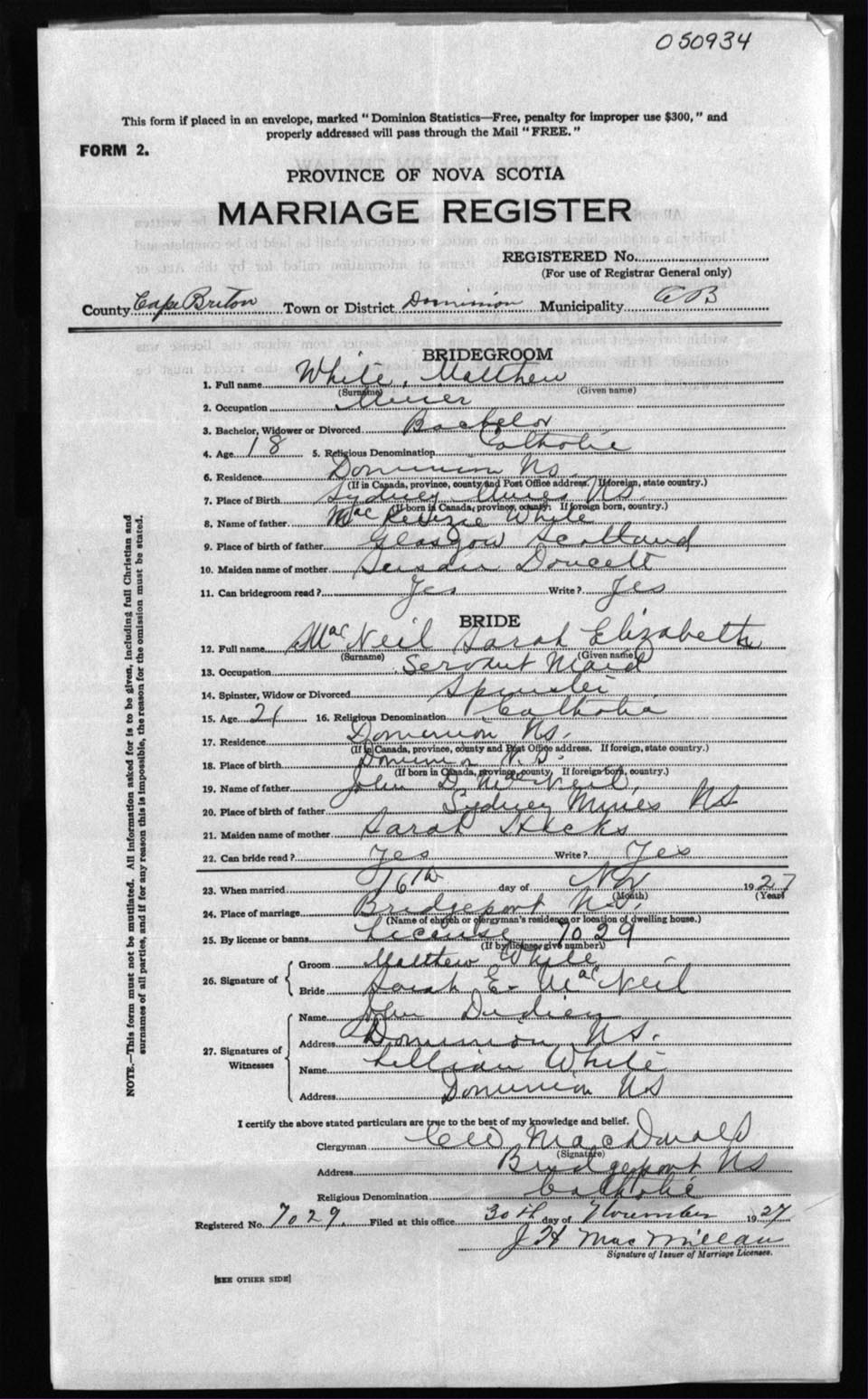 Registration: Year: 1927 number: 50934