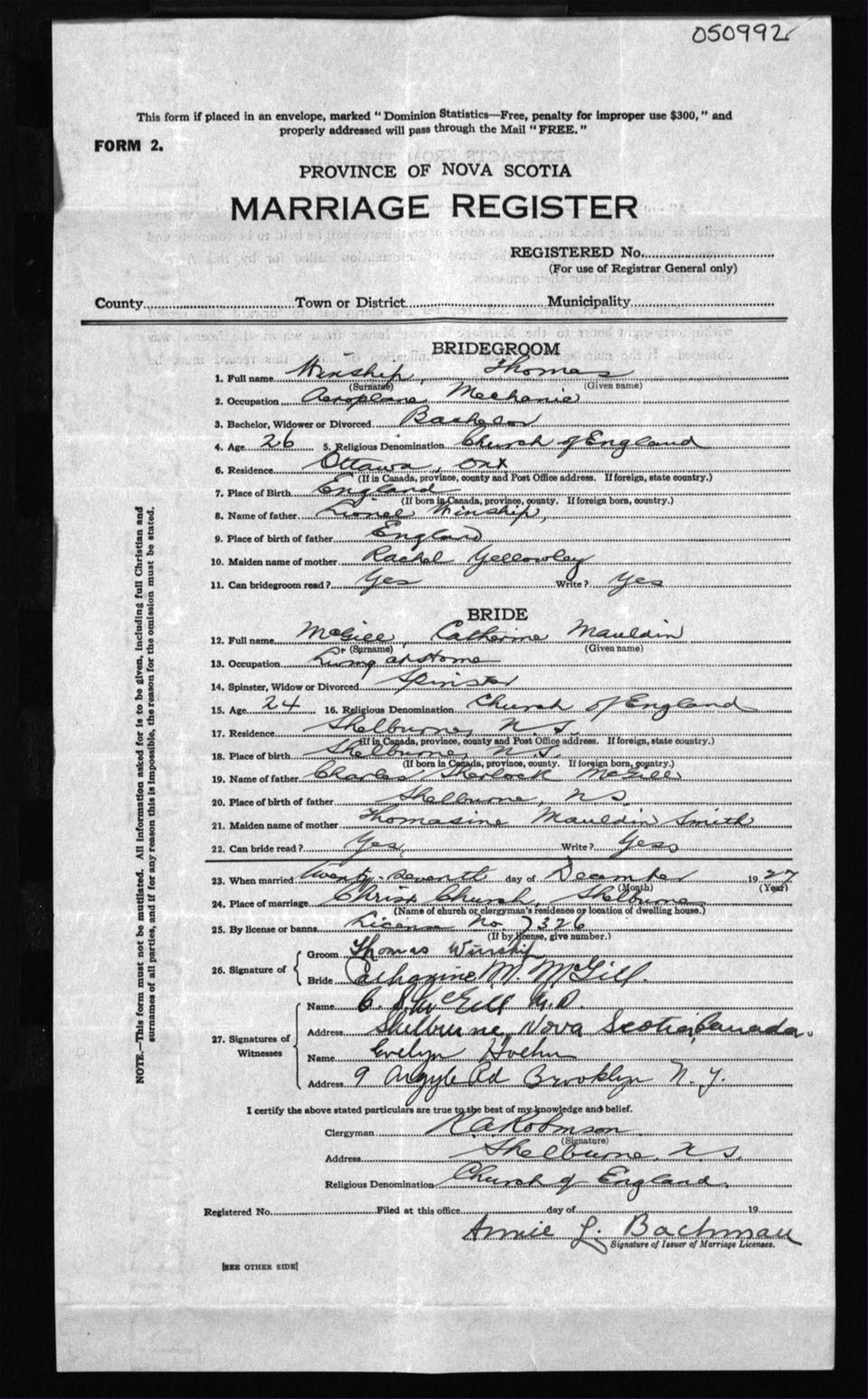 Registration: Year: 1927 number: 50992