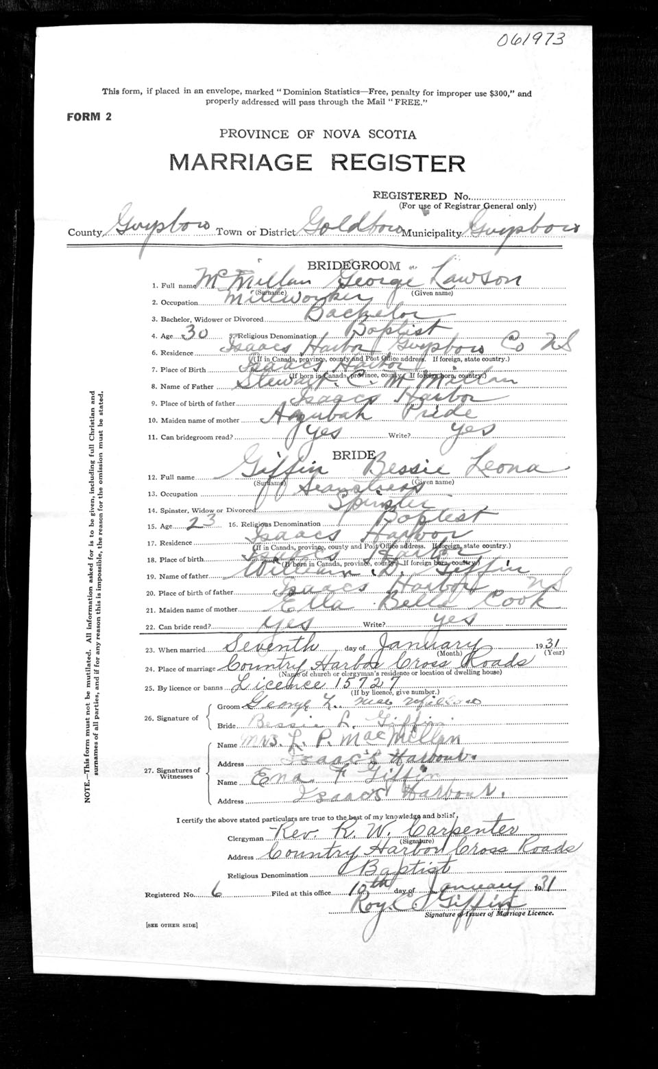 Registration: Year: 1931 number: 61973